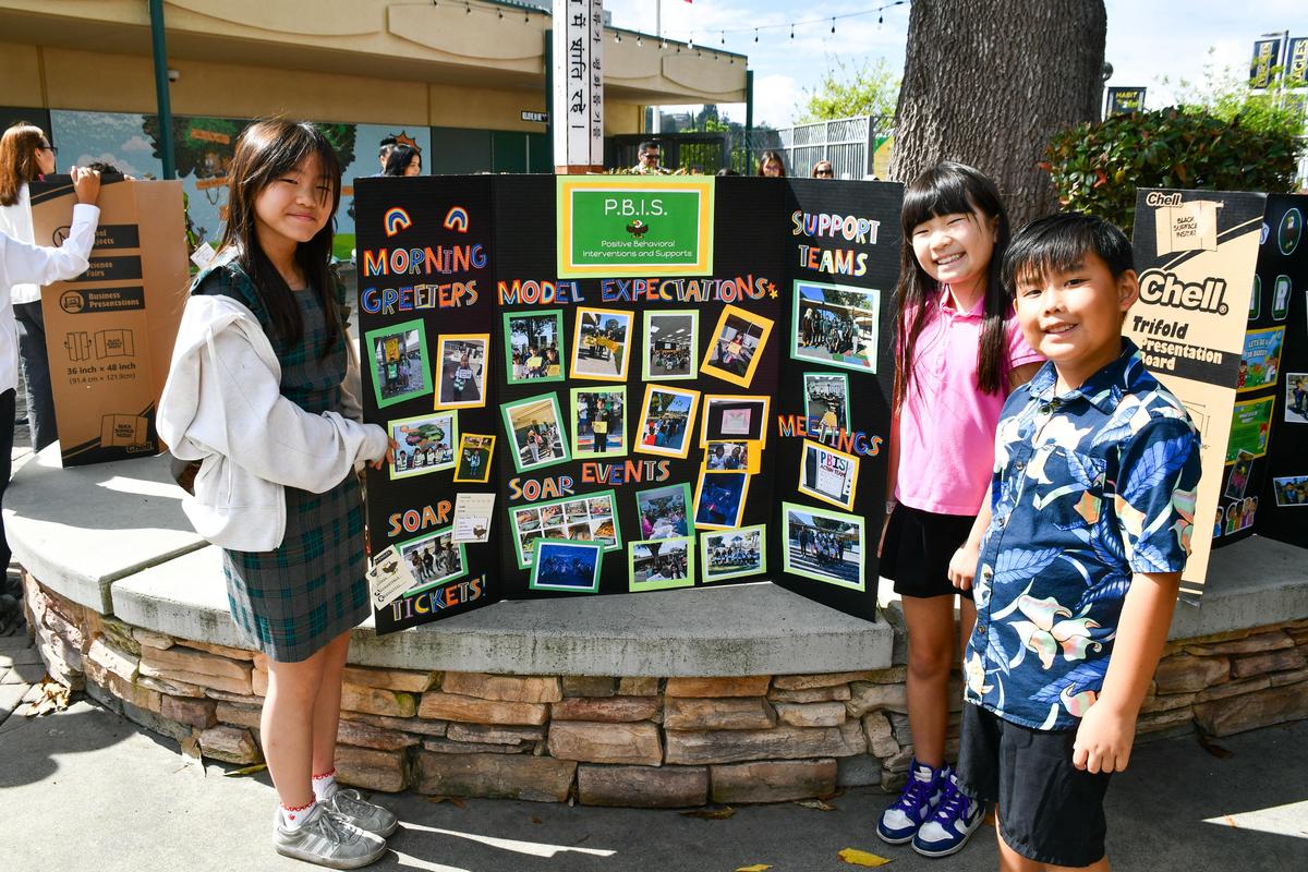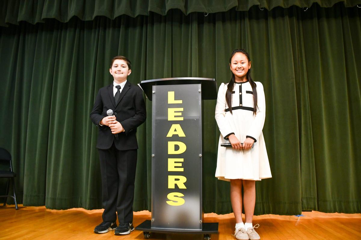 - Fifth-grade students Queena Chen and Fares Beltram pose beside the “Leaders” podium.